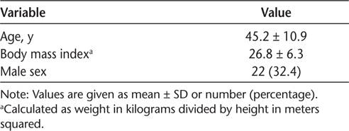 Background demographic characteristics included age, sex, and body mass index (BMI; calculated as weight in kilograms divided by height in meters squared).