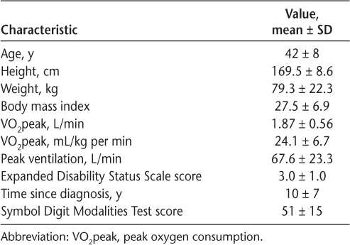Physically inactive adults with relapsing-remitting MS aged 30 to 55 years were recruited from the community for this study. Physical inactivity was assessed via self-report and was defined as less than 60 minutes of moderate-to-vigorous activity per week. All the participants had an Expanded Disability Status Scale score between 0 and 4, had not undergone medication changes during the previous 3 months (Table S1, which is published in the online version of this article at ijmsc.org), were relapse free for longer than 30 days before enrollment, and fulfilled the McDonald criteria for relapsing-remitting MS as confirmed by their physician. Exclusion criteria included progressive presentations of MS (determined by participants’ physicians); self-reported cardiovascular, metabolic, or other neurologic diseases; major depressive symptoms (assessed via the Hospital Anxiety and Depression Scale); pregnancy; and smoking. This study was approved by the University of Illinois at Chicago institutional review board and conformed to the standards outlined in the Declaration of Helsinki. All the participants provided written informed consent before study participation.