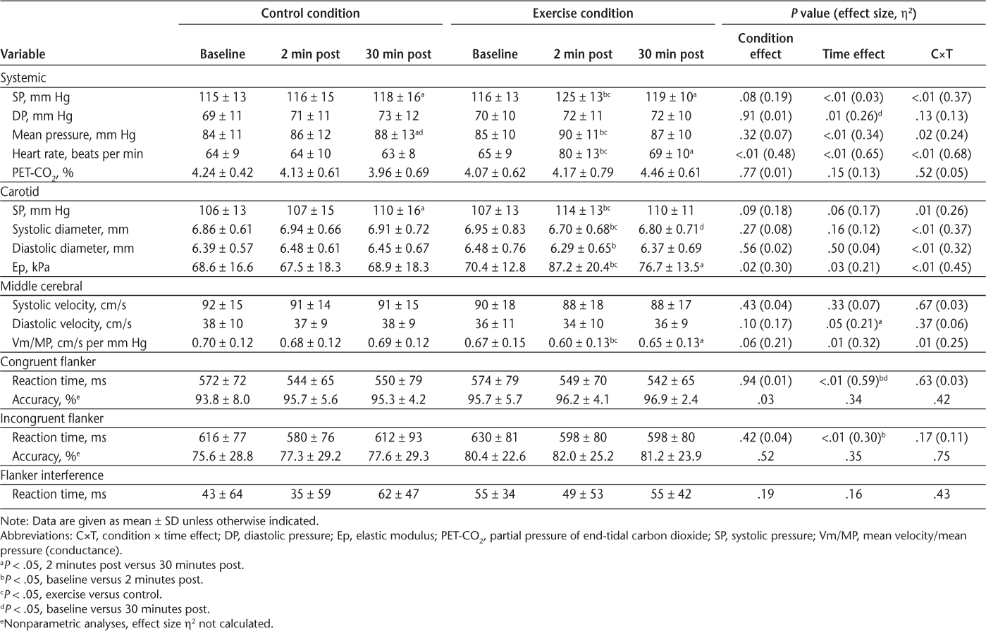 Exercise elicited significant increases in mean pressure and carotid artery stiffness and decreases in MCA conductance at 2 minutes after exercise, which subsided by 30 minutes (P < .05). Exercise did not significantly alter MCA PI. Flanker reaction time decreased during posttesting in both conditions (P < .05). There were no condition × time interactions for cognitive performance.