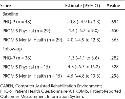 To compare pre-post psychological self-report scores after trial of the CAREN system, we created separate linear regression models (one for each score). The last score recorded during the course of treatment was the dependent variable, and the corresponding baseline score was included as a covariate. Again, variables found to be statistically significantly associated with group were included as covariates.