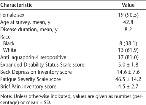Twenty-four patients met the inclusion criteria and were enrolled in this study. Three patients did not have sufficient clinical data available and were subsequently excluded from the analysis. The demographic and clinical characteristics of the remaining 21 patients are detailed in Table 1. The mean ± SD age at the time of completing the EQ-5D-5L was 42.8 ±10.6 (median, 43.0) years, with a mean ± SD disease duration of 8.2 ± 5.0 (median, 9.0) years. The female-to-male ratio was 19:2, and there were 8 African American and 13 white participants. The mean ± SD EDSS score was 5.0 ± 1.8 (median, 5.5), which corresponds to disability severe enough to impair full daily activities and ability to work a full day without special provisions; at an EDSS score of 5.0, patients are still able to walk 200 m without aid or rest. The demographic and clinical profile of the study population is consistent with that of the broader NMOSD population in the United States.