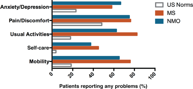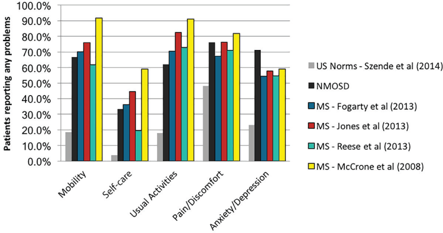 Patients with neuromyelitis optica spectrum disorder (NMOSD) were more likely to report problems with all aspects of quality of life covered by the EQ-5D.