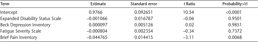 Almost two-thirds of patients reported moderate or severe problems with pain/discomfort on the EQ-5D. In a comparison of the EQ-5D with the other four instruments, the EQ-5D was most closely correlated with the BPI (r 2 = 0.67) (Table 2). The EQ-5D correlations were much weaker with the BDI (r 2 = 0.32), the EDSS (r 2 = 0.28), and the FSS (r 2 = 0.24). Consistent with the univariate correlations, the BPI was the only measure significantly associated with the EQ-5D in the multivariate analysis.