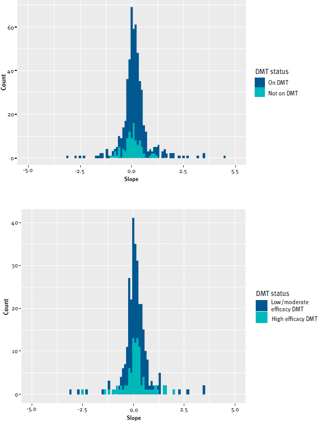 The cohort was 642 individuals, 539 on DMT and 103 off DMT. Median age and disease duration was 49.7 (IQR 42.4-57.9) and 16.6 years (IQR 9.3-23.0) in the DMT group, and 58.9 (IQR 52.2-65.3) and 20.0 years (IQR 14.1-31.4) in the non-DMT group. Both cohorts were predominantly female (75% DMT, 79.6% non-DMT), with a mean of 4 assessments (IQR 3-5), and an average monitoring duration of 1.9 years (1.2-2.4) in the DMT group, and 1.8 years (1.4-2.4) in the non-DMT group. After adjusting for multiple factors, DMT status and intensity were not found to be significant predictors of longitudinal PST change.