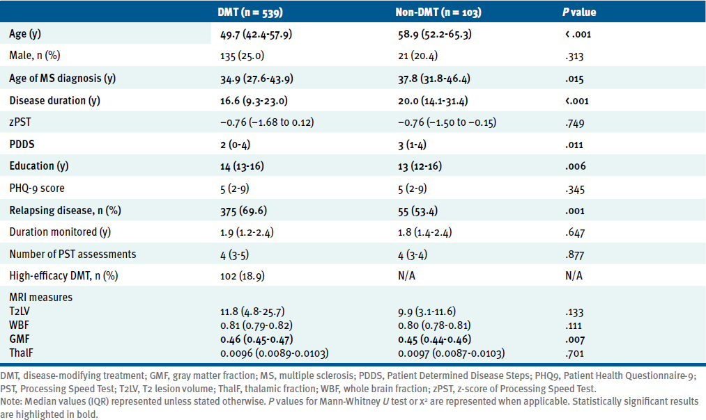 The aims of the current study are to determine whether an association exists between DMT and cognitive processing speed within a large-scale clinical cohort, to evaluate whether significant differences in PST scores exist among individuals on high versus low potency therapies, and to investigate associations between DMT status and MRI correlates of MS-related CI.