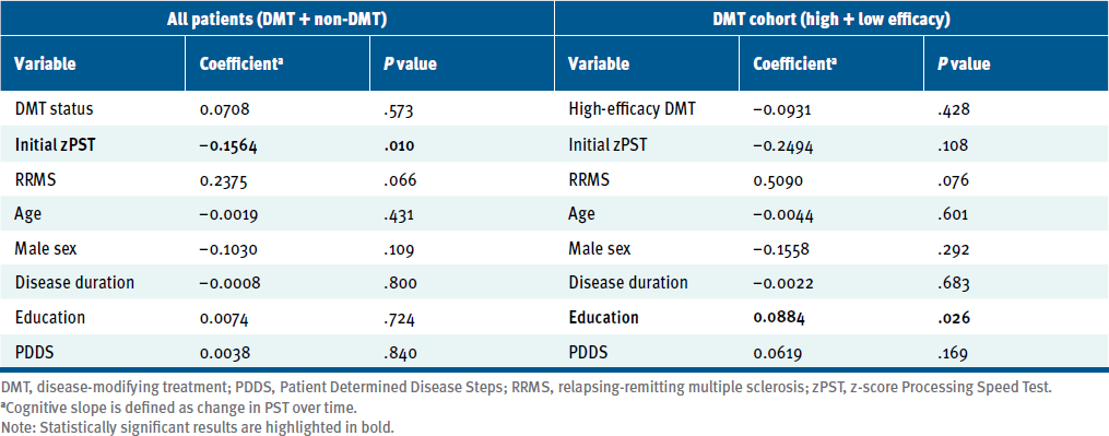 The cognitive slopes calculated for both cohorts were positive, suggesting that PST scores improved during the 2-year period observed. This is likely due to confounding by the practice effect, in which individual testing inevitably leads to performance enhancement on future tests.11,25 The limited length of time observed and number of PSTs recorded are possible contributors to this finding. Nonetheless, DMT status did not appear to be associated with the absolute value of the cognitive slope.