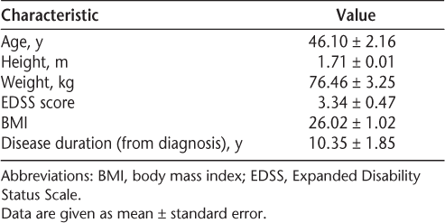 Participants were recruited from local MS support group meetings and through flyers posted at local neurologists' offices. Individuals were included in the study if they had a physician diagnosis of relapsing-remitting MS16 and an EDSS score (as determined by a physician) of less than 6.5 (ambulatory) and exhibited lower-extremity paresis, with one leg being more affected than the other. Paresis was defined as partial or mild paralysis or muscle weakness and was identified by the participant using a medical history and self-reports. Each study participant signed a consent form approved by the university institutional review board prior to enrollment. Participants who had ever used steroids for longer than 3 months at a given time and those with known metabolic disorders that could compromise bone density, including those taking bisphosphonates or similar medications to attenuate bone loss, were excluded. The final study sample consisted of 23 people (2 men and 21 women).