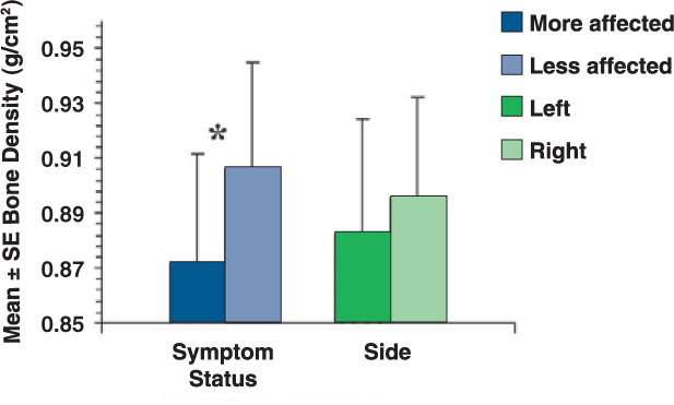 In comparison of aggregate group mean BMD between the left and right hips, no statistically significant differences were observed. However, in evaluating BMD based on participant-reported symptoms in each leg, the more affected leg displayed significantly lower femoral neck BMD (P = .001) (Figure 1). Mean ± SE T and Z scores for the more affected leg were –1.33 ± 0.30 and –0.94 ± 0.25, respectively. Mean T and Z scores for the less affected leg were –1.05 ± 0.27 and –0.66 ± 0.21, respectively. Negative scores indicate lower bone density.