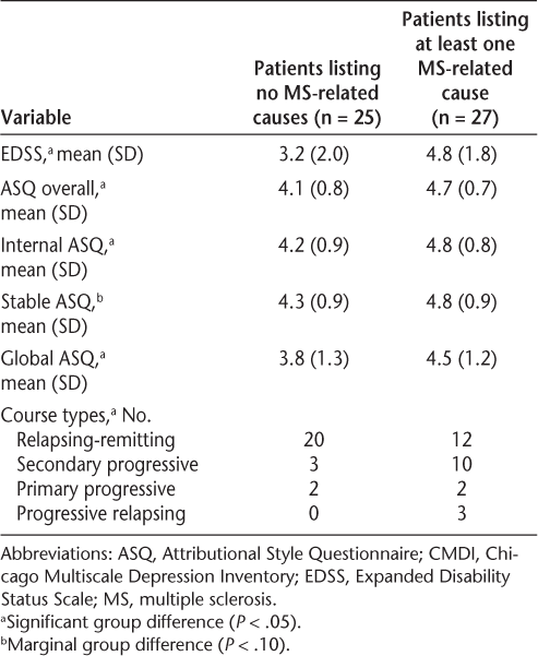 When participants who listed no MS-related causes were compared with those reporting at least one MS-related cause, the group who listed MS-related causes had significantly greater disability, a more depressogenic attributional style overall, more internal and global attributions, and marginally more stable attributions (Table 1). Also, the group listing MS-related causes had significantly more participants with secondary progressive and progressive relapsing courses (χ3 2 = 8.71, P < .05). The group differences in overall, internal, and global attributional style remained significant after controlling for disability and course type (P < .01), and the difference in global attributional style became marginal (P < .10).