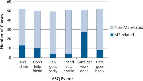 Twenty-five participants with MS did not list any MS-related causes on the ASQ. One participant listed only MS-related causes. Therefore, subsequent MS-related analyses included 27 participants and non-MS analyses included 51 participants. For the six negative events in the ASQ, an average of 22% of causes listed for each event were coded as MS-related (range, 8–53%). The events most likely to be attributed to an MS-related cause were not being able to get the work done that is expected of them, and not being able to find a job (53% and 25%, respectively; Figure 1). Overall, MS-related causes were rated as being significantly more internal, stable, and global than non-MS-related causes (t 76 = 8.37, P < .0001; mean difference = 1.69). Participants made significantly more MS-related attributions for work-related events than for relationship-related events (χ1 2 = 8.70, P < .01). Participants also rated significantly more causes as MS-related for one specific event—not being able to get the work done that is expected of them—than for all of the other events (χ1 2 = 33.20, P < .0001).