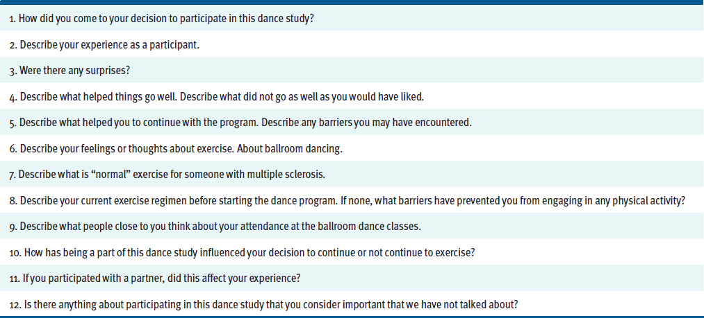 Briefly, dance sessions were led by professional dance instructors who were trained by the research team to have a working knowledge of MS, and who, likewise, shared their artistic and pedagogical knowledge and experience with the research team. Sessions consisted of a warm-up followed by 45 minutes of dance steps (ie, salsa, rumba, foxtrot, swing, waltz, American tango, or push-pull) and a cool-down. Dances were individualized, with some participants performing smaller steps or dancing in half time. Instructors provided appropriate recorded music. Everyone participated with a partner, either one they brought or volunteers from the research team. At the conclusion of the intervention, people with MS who had attended at least 8 of the 10 weeks of dance sessions were invited to participate in 1 of several focus groups.