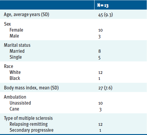 Participants in the dance intervention were recruited from the community or through the local chapter of the National Multiple Sclerosis Society. Dance sessions were held in 1 academic and 1 community setting from 2014 to 2015. The dance program was developed by the research team of our larger study18 and was similar to that previously reported.17 Focus group participants were chosen from those who took part in the study. See TABLE 1 for participant demographics.