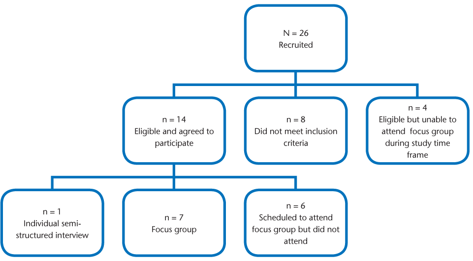 A total of 26 individuals were recruited (Figure 1), 25 via the above-mentioned recruitment strategies and 1 via snowball sampling. Eight participants did not meet the inclusion criteria, and 14 agreed to participate in the focus group discussions. Four people were eligible but were unable to attend the focus groups within the study timeframe. Of the 14 people who agreed to attend the focus groups, only 8 attended. Two of the six nonattenders contacted the researchers and cited a) lack of child care and b) lack of transportation as reasons for nonattendance at the focus group, while it is unknown why the other four expected participants did not attend. Although two focus groups were planned, only one participant attended the first scheduled focus group. Therefore, data collection was based on one semi-structured individual interview and one focus group.