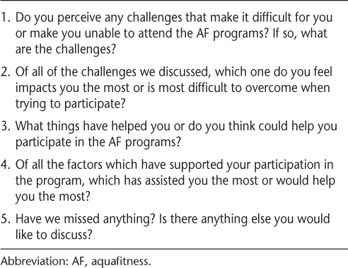 Each participant completed a demographic questionnaire prior to the focus group discussion that asked the participant's age, sex, year diagnosed with MS, and type of MS, as well as current or past involvement in AF programs. A semi-structured question guide was developed for the focus group (65 minutes' duration) and was adapted for the individual interview (40 minutes' duration) (Table 1). The individual interview and focus group were held at the MS Society of Canada, Manitoba Division, which was environmentally accessible and familiar to the participants.