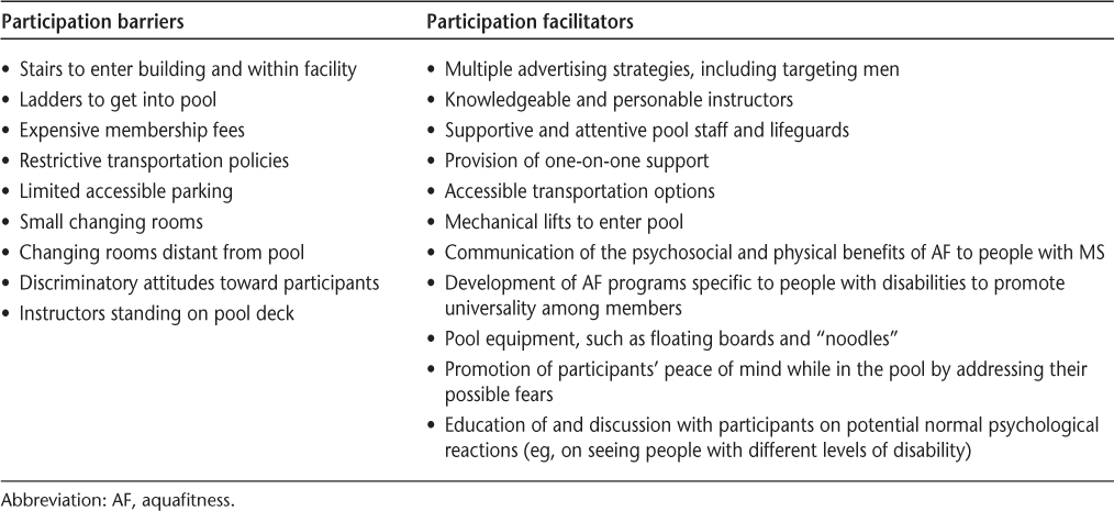 Information on the barriers and facilitators related to AF programming can be useful to AF instructors, MS clinicians, and recreational facility program planners. Table 3 provides a summary of these barriers and facilitators and can serve as a checklist for service providers and program planners who are initiating new aquatics programs or reviewing current programming.