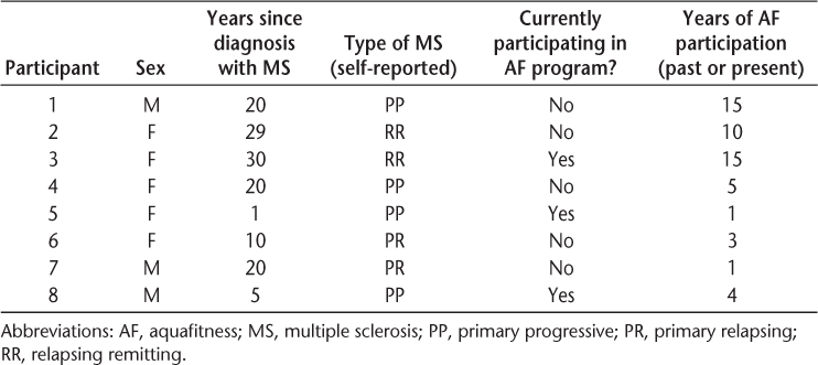 Five females and three males between the ages of 47 and 66 years participated (Table 2). Participants had been diagnosed with MS from 1 to 30 years previously. Diagnoses cited included primary progressive (n = 4), progressive relapsing (n = 2), and relapsing remitting (n = 2). Three of the participants were currently involved in AF programming, while the other five had participated in the past. Duration of participation in the AF programming ranged from 1 to 15 years.