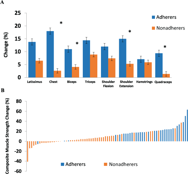 Mean ± SD changes in strength in each muscle group in adherers versus nonadherers (A) and mean changes in individual training responses in overall strength for each participant (B) after 16 weeks