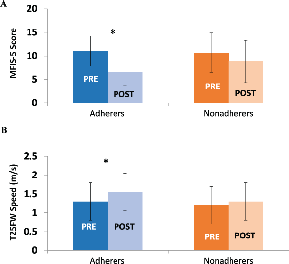 Changes in mobility assessed by the 25-Foot Walk test are presented in part B of Figure 3. There was a significant increase in walking speed for the Timed 25-Foot Walk test (group × time interaction: F = 11.02, P = .002) in adherers after 16 weeks of following the PAGs (pre: 1.4 ± 0.5 m/s; post: 1.6 ± 0.5 m/s), with no change in nonadherers.