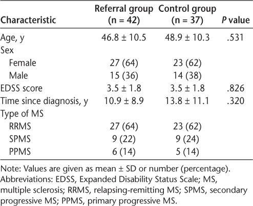 Of 91 participants randomized (Figure S1), 79 completed the 16-week randomized controlled trial (mean ± SD: age, 47.9 ± 10.0 years; EDSS score, 3.5 ± 1.8; years living with MS, 12.1 ± 10.0). Participant characteristics stratified by group are presented in Table 1. There were no significant differences in demographic characteristics between groups.