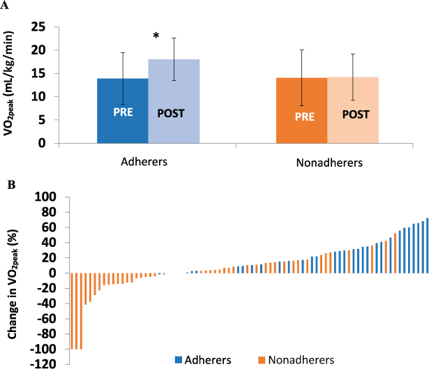 Mean ± SD changes in peak oxygen consumption (VO2peak) in adherers versus nonadherers (A) and mean changes in individual training responses in VO2peak for each participant (B) after 16 weeks
