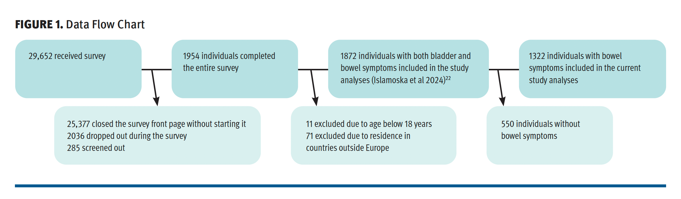 Of 29,652 initial participants, 25,377 did not start the survey, 2036 dropped out, and 285 were screened out for not having MS, leaving data from 1954 individuals. Further exclusions were 11 individuals younger than 18 years and 71 individuals residing outside France, Germany, Italy, or the UK. Of 1872 eligible individuals with MS who completed the survey in their respective local languages (response rate: 6.3%), 1322 individuals were identified as experiencing bowel problems. These individuals were included in the final study population for analysis (Figure 1). The survey was conducted online from April 2022 to November 2022, and ethical guidelines for anonymized research were followed.