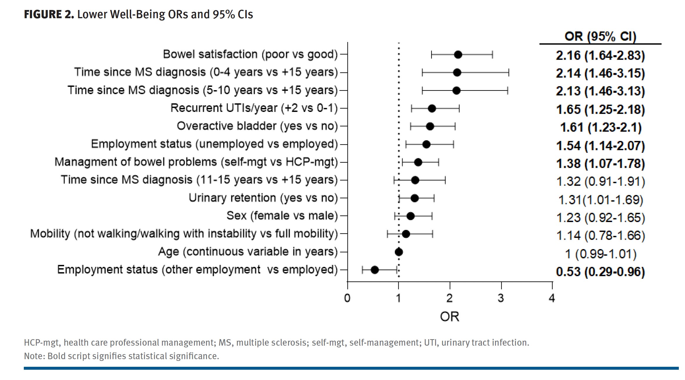 The association between bowel problems and well-being—adjusted for sex, age, time since MS diagnosis, employment status, bowel management, mobility, and urinary problems—showed a 2 times higher odds of lower well-being for people with MS who reported poor satisfaction with their bowel function (OR, 2.16; 95% CI, 1.64-2.83) and a 38% higher odds of lower