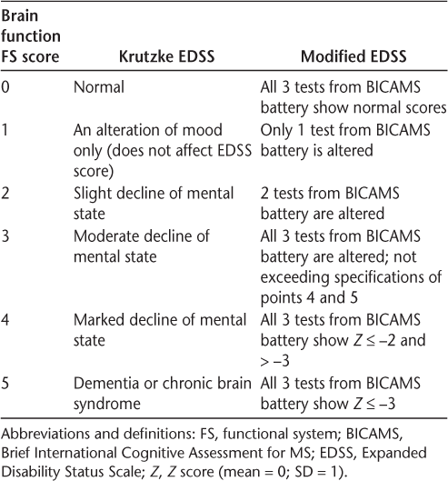 The Expanded Disability Status Scale (EDSS)1 is the most popular tool for assessing disability in patients with multiple sclerosis (MS). Despite its limitations, the EDSS prevails as the main tool for assessing disability in clinical practice.2 Its final score, which can range from 0 (normal neurologic examination) to 10 (death by MS), is determined by a combination of intermediate scores obtained by assessing different functional systems (FSs) and mobility. Within FSs, the brain function FS is assessed and provides a score that ranges from 0 (normal) to 5 (dementia). The disadvantage of the brain function FS lies in the fact that it does not specify the tools used for defining the intermediate points. With the aim of improving reliability, Kappos et al3 developed Neurostatus by modifying gait assessment criteria and including new definitions for each FS. Although this approach to brain function FS is clearer, it does not propose a single test or homogeneous assessment criteria.