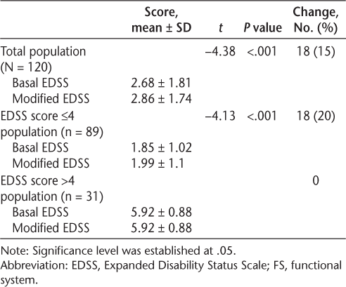 Comparing the basal EDSS scores with the modified EDSS scores, the latter were found to be higher, demonstrating that patients showed greater global disability when cognition was taken into account (P < .001). Eighteen patients (15%) showed a change in their EDSS score, all of whom had a basal EDSS score of 4.0 or less. After repeating the analysis in the subgroup of patients with a basal EDSS score of 4.0 or less, we discovered that the scores obtained in the modified EDSS were higher (P < .001) and that 20.22% of the patients showed different scores on the EDSS after correction through objective measures. Results are shown in Table 2.