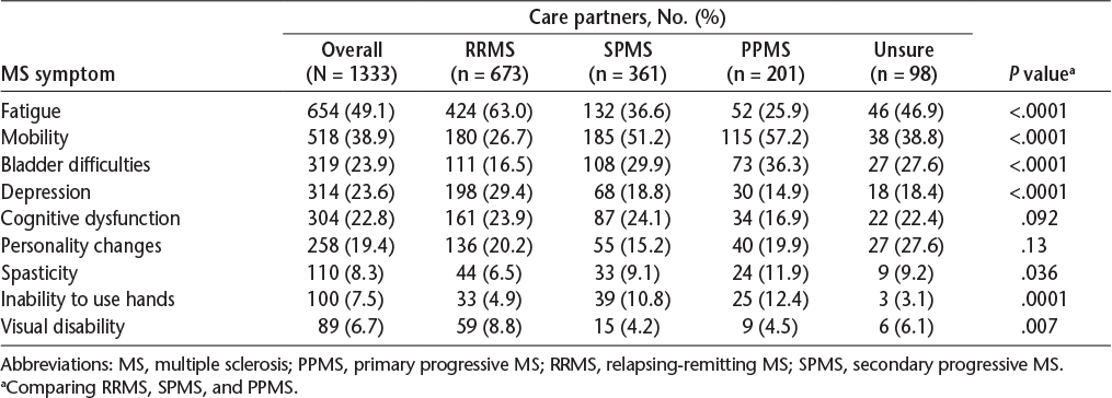 Overall, the MS symptoms most often perceived as stressful were fatigue and impaired mobility, followed by bladder difficulties, depression, cognitive dysfunction, and personality changes (Table 5). Male care partners reported that fatigue and spasticity were more stressful than did female care partners (P < .0001 and P = .002, respectively); the stress associated with other symptoms did not differ by sex. The MS symptoms deemed to be most stressful differed across MS types. Impaired mobility was the most stressful factor for care partners of people with SPMS and PPMS. Fatigue and bladder difficulties were the next most stressful factors, although in reverse order for PPMS versus SPMS. However, care partners of people with RRMS reported fatigue to be the most stressful, followed by depression and impaired mobility. Spasticity, impaired hand function, and visual impairment were less frequently rated as being stressful than other symptoms, but all were considered more of a concern for PPMS than for RRMS or SPMS.