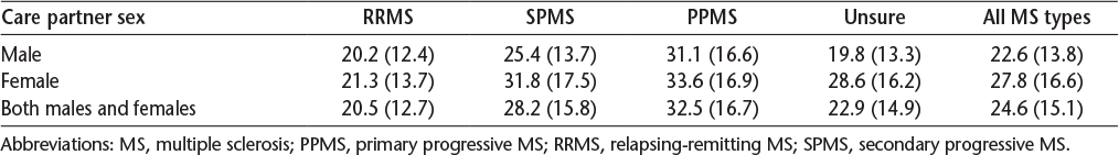 This study had several limitations. Although care partners of men were slightly more likely to respond,47 mean (SD) overall response rates were somewhat low (11% vs. 34.6% [15.7%]) compared with Internet-based response rates reported in the literature.48 This may have been affected by unsuccessful initial attempts to contact the care partner via the registry person with MS or by decisions to not participate based on the level of burden experienced by the care partner at the time because less than half of the sample was composed of those with more advanced MS. Because we used volunteers, findings may represent those of care partners who were especially motivated, uniquely stressed, or both. Generalizability may also be hindered by the use of an online questionnaire because participants with access to a computer may differ from those without such access.