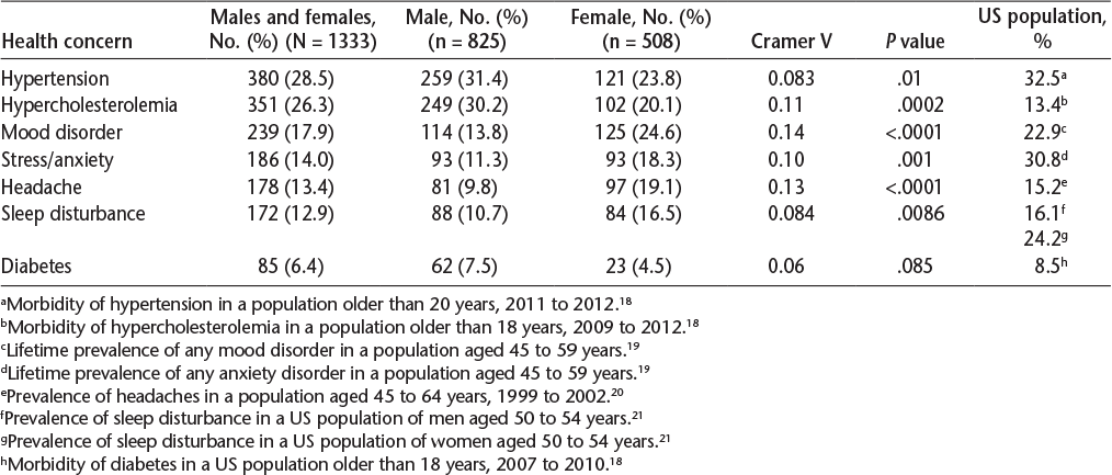 Overall, 73.6% of respondents (918 of 1248) had informed their primary-care physicians of their role as a care partner. Men (71.8%) were slightly less likely to inform their physicians than were women (76.4%, P = .08). With respect to use of medications for specific health concerns, this was common among care partners, with the most frequent concerns being hypertension, hypercholesterolemia, and mood disorders (Table 4). Male care partners were more likely to endorse physical health concerns, such as hypertension, and women were more likely to endorse psychological symptoms, such as mood disorder and stress. Women were also more likely to endorse medication use for headaches and sleep disturbance.