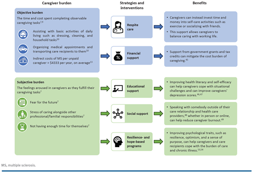 MS caregivers require social support, including the ability to speak with somebody outside of their care relationship and HCPs.48 Social support reduces caregiver burnout,49 whereas a lack of support is associated with poorer caregiver mental health, independent of patient health status and disease severity.50