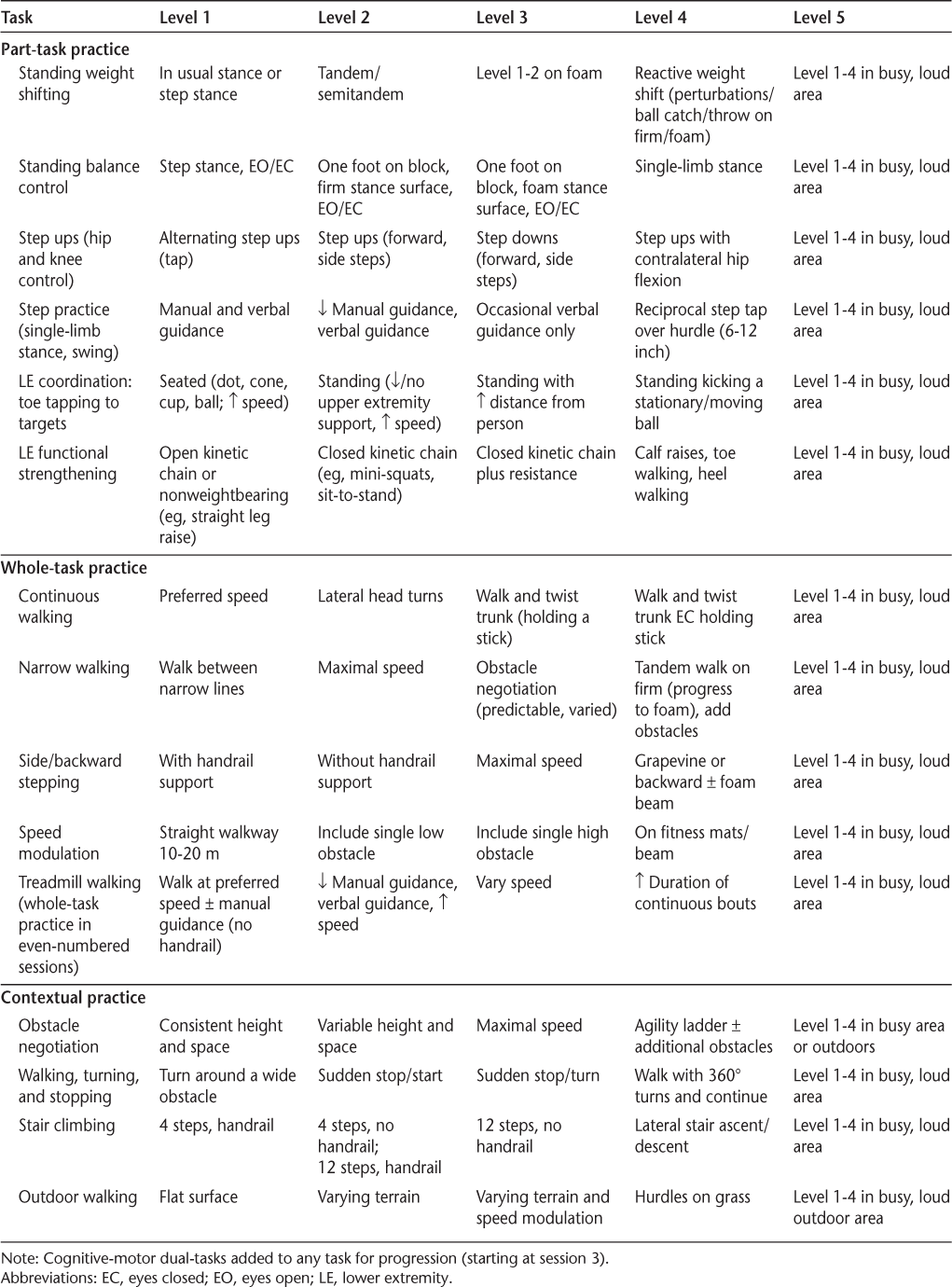 Dual-task training was also incorporated in sessions 3 to 12 as part of the gait training intervention (whole-task practice), and to increase functional difficulty during part-task practice and contextual transfer activities as appropriate. Ten different tasks were used to involve a range of cognitive functions (working memory, executive function, visuospatial processing, and language) during dual-task training. Cognitive tasks were progressed based on the individual's performance and the progression of gait activities.