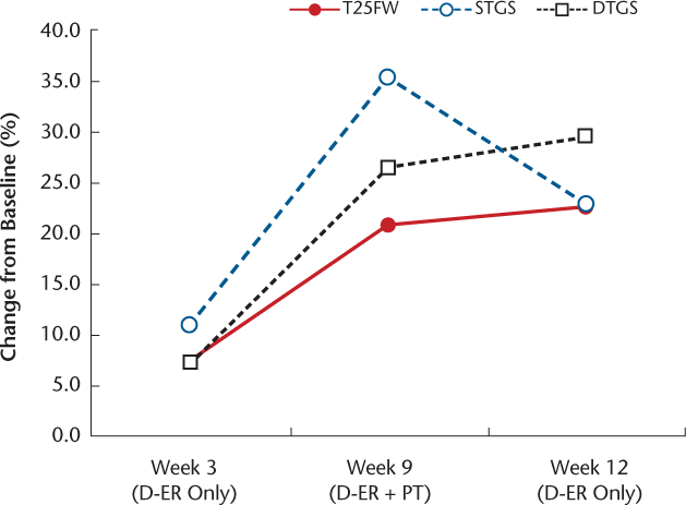 After 6 weeks of D-ER + PT, she had a further 14.6% improvement in Timed 25-Foot Walk gait speed, for a total improvement of 20.7%, which elevated her above the clinically meaningful threshold of 20%. Similar patterns of improvement were also observed for self-selected gait speed in single- and dual-task conditions. Improvements in fast and dual-task gait speed were retained 3 weeks later.