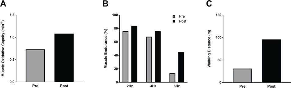 Muscle oxidative capacity increased from 0.73 min−1 to 1.08 min−1 (48%). Muscle endurance increased from 75.9% to 84.0% at 2 Hz, from 67.8% to 76.2% at 4 Hz, and from 13.5% to 44.7% at 6 Hz. Maximal voluntary contraction decreased by 0.68 kg (15%), Timed 25-Foot Walk test speed decreased by 0.19 ft/s (20%), and 2-Minute Walk Test distance increased by 65 m (212%).