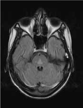 Magnetic resonance image of brain shows symmetrical, central high signal in pons on axial fluid-attenuated inversion recovery sequences
