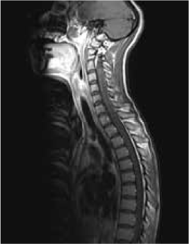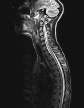Magnetic resonance image of spine shows longitudinally extensive intrinsic increased cord signal on sagittal T2-weighted sequences
