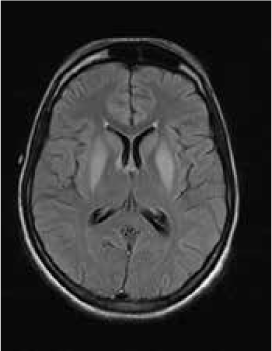 Magnetic resonance image of brain shows bilateral symmetrical high signal in caudate and lentiform nuclei on axial fluid-attenuated inversion recovery sequences