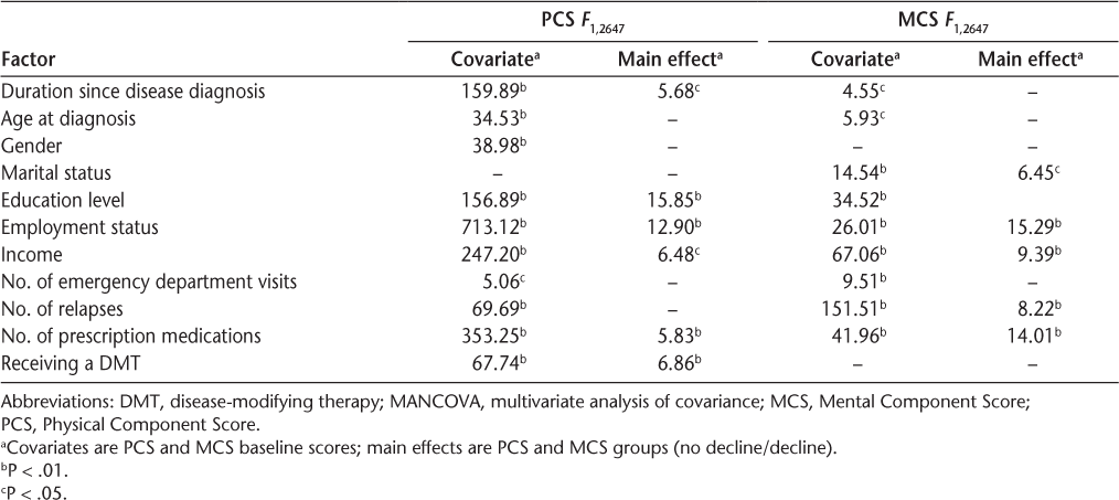 The sample was grouped, post hoc, into MS participants who indicated a clinically significant decline in their HRQOL and those who did not. To address the question of what baseline factors may be related to deterioration in HRQOL, two multivariate analyses of covariance (MANCOVAs) were performed separately for the PCS and MCS change scores. Eleven factors were entered into each of the equations, with baseline HRQOL scores as covariates: duration since disease diagnosis, age at diagnosis, gender, marital status, education level, employment status, income, number of emergency department visits, number of relapses, number of prescription medications, and receiving a DMT. All dichotomous variables were coded as 0 and 1 for the analyses. All analyses were considered significant at an alpha level of .05. The Bonferroni method was used for all post hoc comparisons.