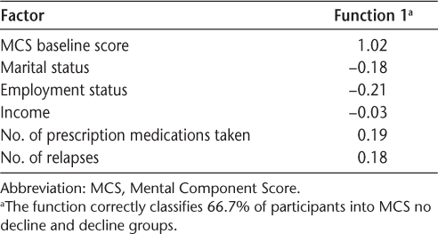 To assess the strength of the factors in predicting decline in mental HRQOL, the MANCOVA was followed by a discriminant function analysis, using only the factors significant in the MANCOVA plus the covariate. Results indicated that there was one statistically significant factor that explained the differences between the MCS no decline and MCS decline groups: the baseline MCS score (Λ = 0.92, P < .01). Table 7 shows the standardized canonical discriminant function coefficients, with larger values indicating greater contribution of the factor to the distinction between the groups.