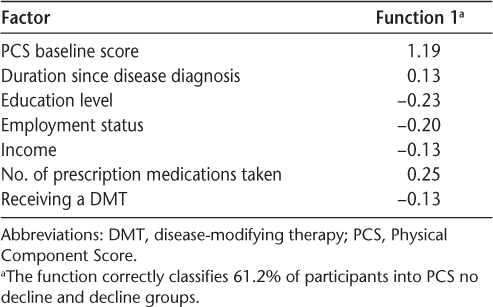 To assess the strength of the factors in predicting decline in physical HRQOL, the MANCOVA was followed by a discriminant function analysis, using only the factors significant in the MANCOVA plus the covariate. Results indicated that there was one statistically significant factor that explained the differences between the PCS no decline and PCS decline groups: the PCS baseline score (Λ = 0.94, P < .01). Table 6 shows the standardized canonical discriminant function coefficients, with larger values indicating greater contribution of the factor to the distinction between the groups.