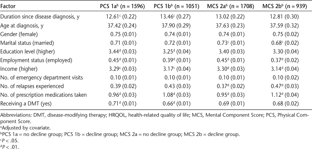 After controlling for baseline scores, having a lower education, having greater duration since disease diagnosis, not being employed, having a lower income, not receiving a DMT, and taking a greater number of prescription medications were significantly associated with a clinically significant decline in physical HRQOL.