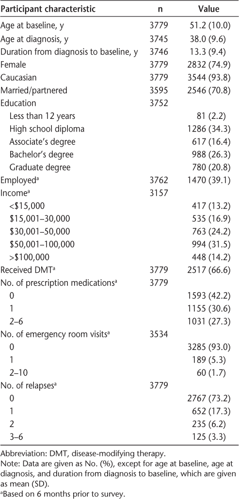The sample consisted of the 3779 Registry participants who responded to the fall 2003 and fall 2008 surveys. Most participants were female, Caucasian, married, educated to the postsecondary level, and unemployed (Table 1). The average age was 51 years, and the average duration from disease diagnosis to the baseline assessment was 13 years, ranging from 0 to 59 years. The characteristics of this sample are similar to those in other studies using the NARCOMS Registry,20 as well as to reported characteristics of those with this chronic condition.