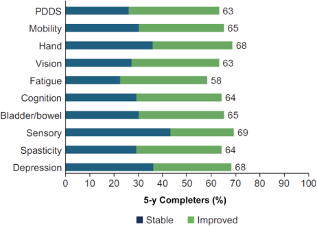 Stable or improved Patient-Determined Disease Steps (PDDS) and Performance Scales domain scores at 5 years in 5-year completer subgroup (n = 93)