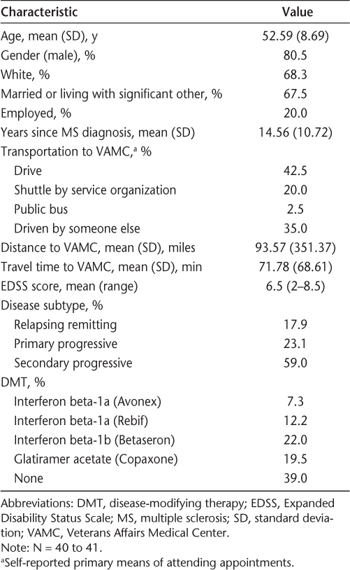 The mean age of participants was 52.6 years, and the average number of years since diagnosis with MS was 14.6. The majority of participants were male, white, and either married or living with a significant other. Only one-fifth were employed. Over half (59.0%) had been diagnosed with secondary progressive MS. The median EDSS score was 6.5 (range, 2.0–8.5), reflecting a wide range of disability but suggesting that, on average, individuals needed bilateral assistance to ambulate short distances. Over half (61.0%) were currently receiving a DMT. The primary method of transportation to VA medical appointments was either driving or being driven by someone else. The average distance to a VA medical center was over 90 miles, and the average travel time was over 1 hour, although time and distance were often considerably greater in some rural areas. Demographic characteristics of the study sample are shown in greater detail in Table 1.