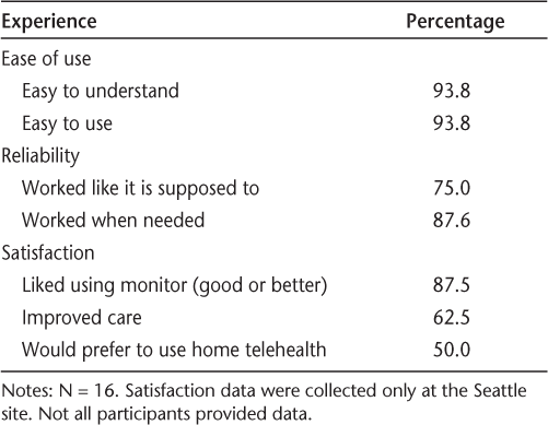 Overall, 65.9% of participants provided self-reported symptom data across all 6 months of study monitoring, and 85.4% provided data for 5 of the 6 months. In general, participants reported few difficulties using home telehealth monitors. Over 90% of individuals stated that they were both easy to understand and easy to use. With respect to reliability, 75% or greater noted that the monitor worked “like it was supposed to” and “when needed.” Satisfaction ratings were generally high, with 87.5% rating the experience good or better, 62.5% feeling that the monitor improved their care, and 50.0% preferring the monitor to an in-person clinic visit. Additional information on participant experiences is provided in Table 2.