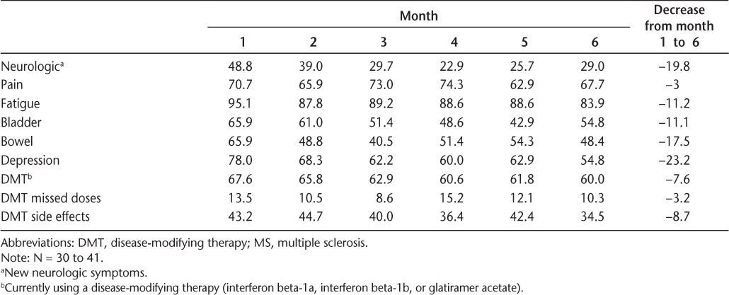 Overall, the frequency with which MS-related symptoms were reported declined over the course of the study period. The greatest decline in the frequency of reporting was seen in depression (change of 23.2 percentage points), followed by neurologic symptoms (19.8), bowel symptoms (17.5), and fatigue (11.2). The proportions of individuals who reported pain and missed doses of the DMT were fairly stable over the study period (decline of approximately 3 percentage points). Despite what were in some cases substantial reductions in the reporting of symptom and medication items from month 1 to month 6, none of these reductions was statistically significant, owing in large part to the modest sample size of the study. Additional information can be found in Table 3.