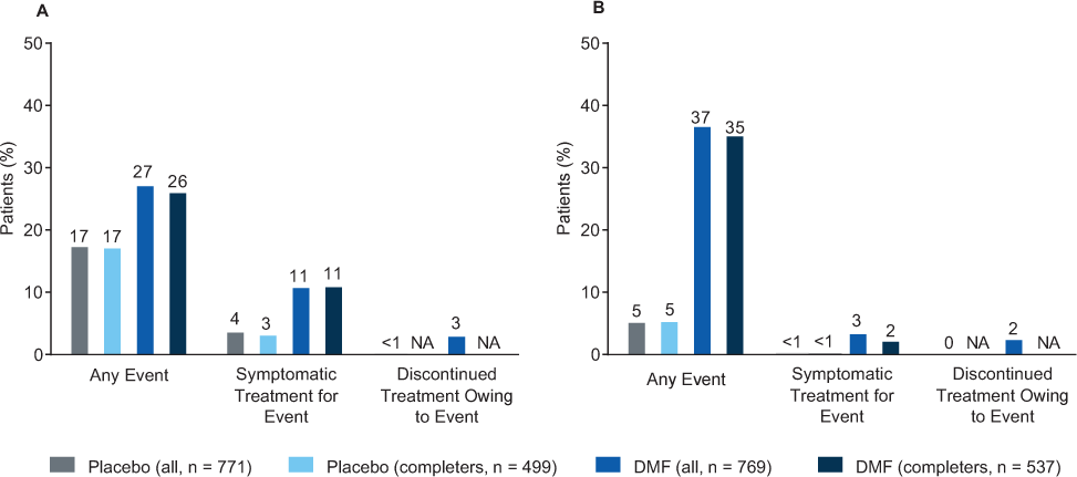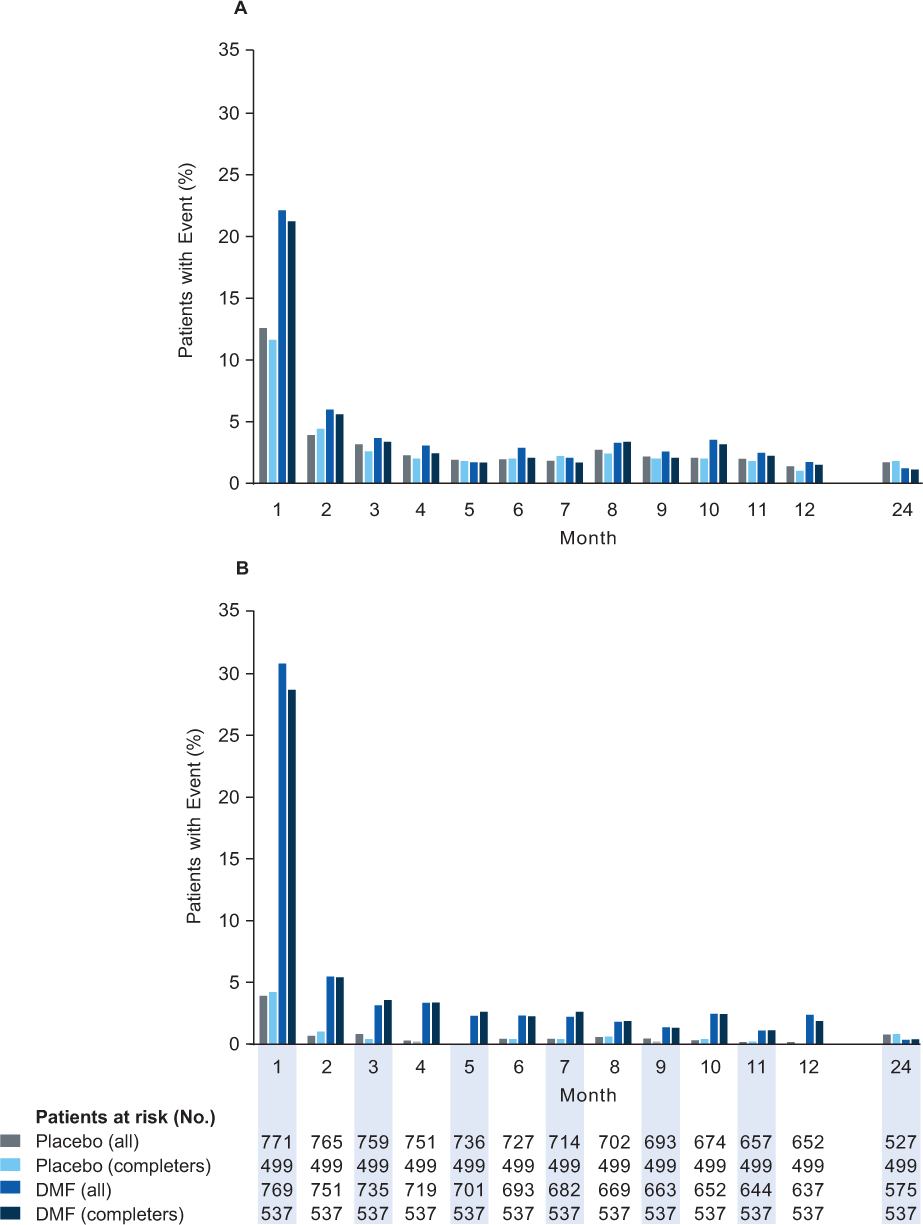 A small percentage of patients experienced flushing and related symptoms during months 0 to 3 and discontinued study treatment due to flushing and related symptoms during the 2-year study period (0% in the placebo group and 2% in the DMF group) (Figure 2B). The percentages of patients who experienced flushing and related symptoms during months 0 to 3 and used symptomatic treatments were less than 1% in the placebo group and 3% in the DMF group (Figure 2B). Patients who completed the study were comparable with the overall study population in terms of the incidence of flushing and related symptoms and symptomatic treatment use for flushing and related symptoms (Figure 2B).