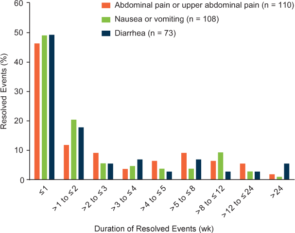 Common gastrointestinal events (abdominal pain, nausea/vomiting, and diarrhea) during the initial treatment period: duration of resolved events