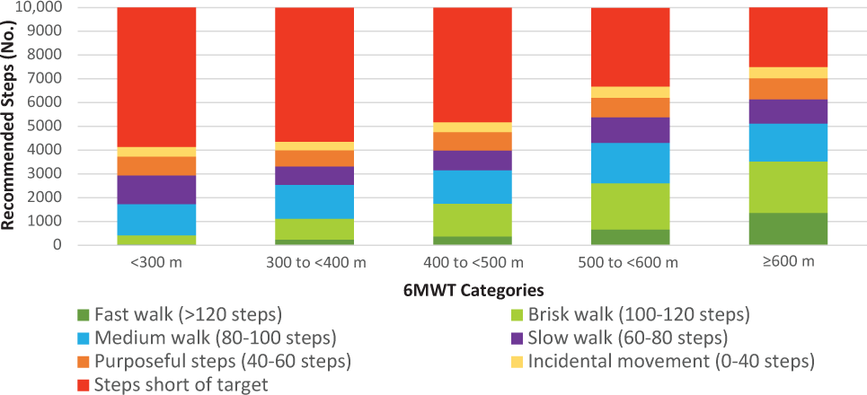 Also shown in Table S1 is that the distribution of the duration of walking bouts did not differ by walking capacity. Although the total number of steps taken per day was greater, on average, for people with higher walking capacity, they did not allocate these steps toward walking for longer durations. To illustrate, people who walked less than 300 m spent an average of 50.7% of their daily upright time (standing and stepping) walking in short bouts of 1 minute. The average duration of vertical time (standing and stepping time) per day increased across the group of patients who walked less than 300 m to the group who walked 600 m or more; there was no difference in the proportion of time allocated to longer bouts of walking. Figure 1 displays the data in Table S1 as a stacked bar graph showing the proportion of steps at different cadence bands contributing toward the recommended total of 10,000 steps for healthy people.